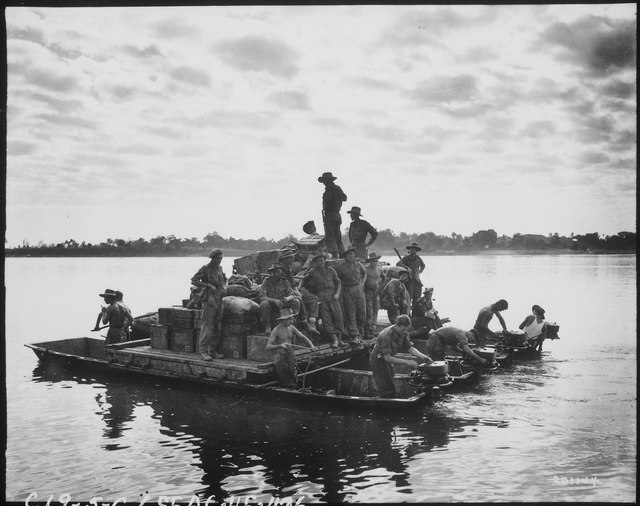 Burma men crossing the Irrawaddy River near Tigyiang. Modern barges are a little bit bigger.